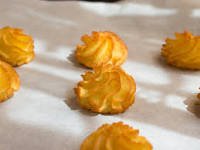 Alles in einen Spritzbeutel füllen und mit der großen sternförmigen Öffnung auf ein mit Backpapier ausgelegtes Blech Rosetten drücken. Das zweite Eigelb mit 1/2 EL Wasser mischen und jede Kartoffelrosette damit einpinseln. Im 175° heißen Ofen ungefähr 10 Minuten backen, bis die Kartoffeln goldgelb geworden sind.